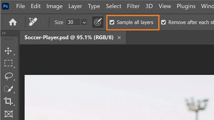 Bước 3: Sau khi chọn Remove Tool, tích chọn Sample All Layers để tạo một layer mới trước khi bắt đầu xoá vật thể, thao tác này sẽ giúp người dùng có thể quay lại bản gốc để chỉnh sửa nếu cần.
